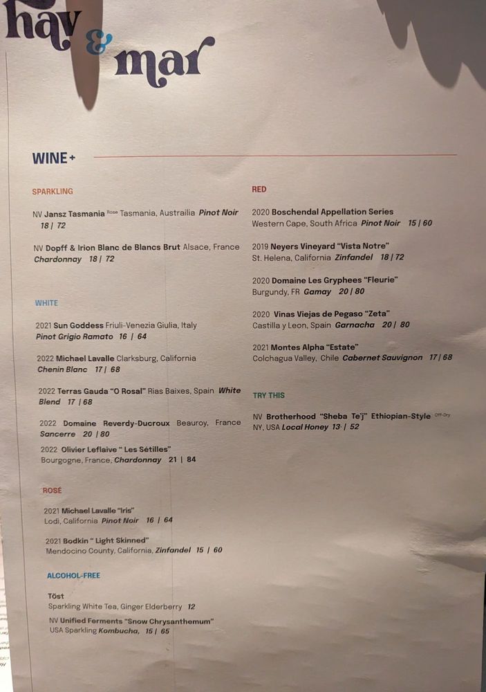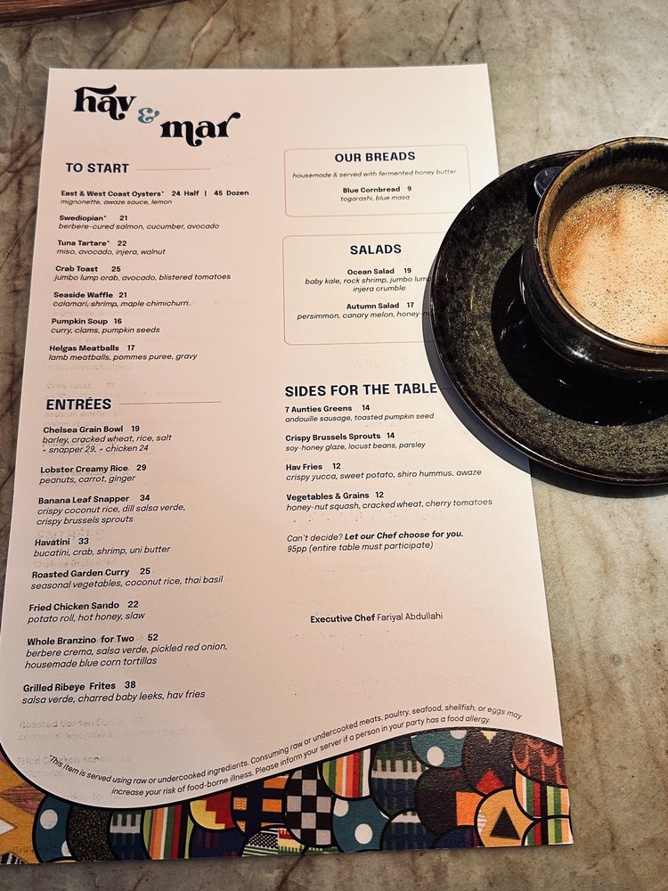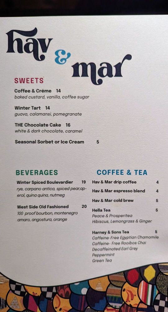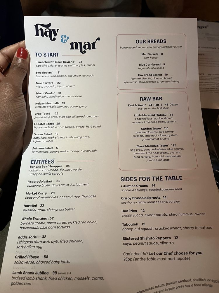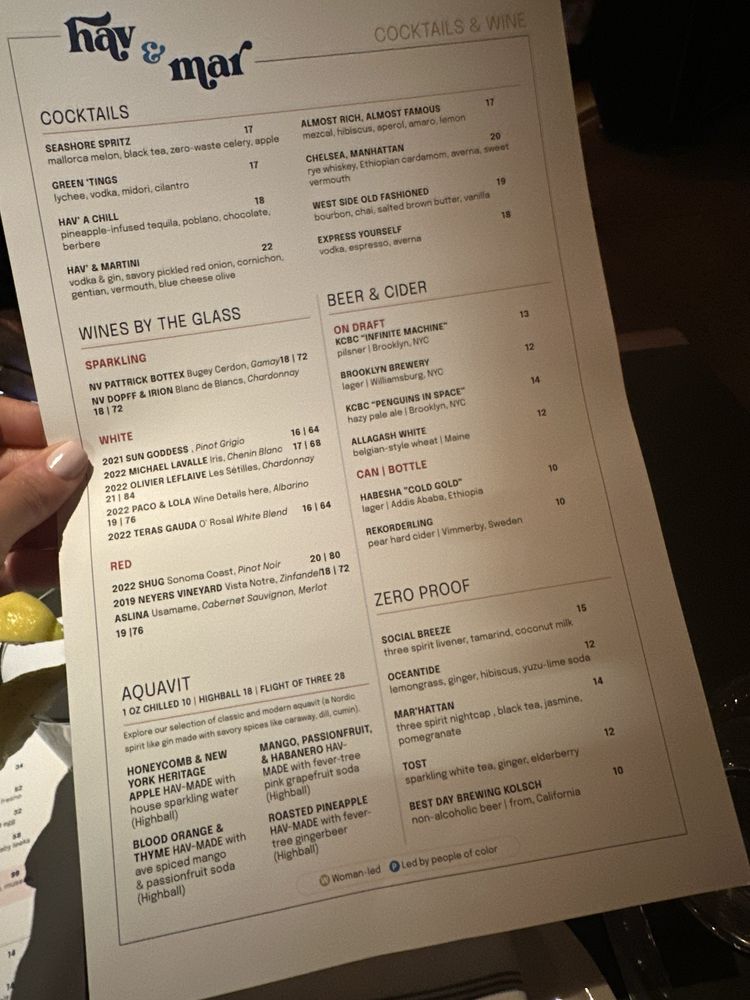 Introducing Hav & Mar, a trendy, upscale cocktail bar specializing in seafood located in New York City. The restaurant offers a variety of amenities, including reservations, takeout, and delivery, making it a convenient choice for diners. Known for its romantic ambiance and excellent service, Hav & Mar boasts a diverse menu featuring dishes like Tuna Tartare, Seared Striped Bass, and Havatini. Customers have raved about the delicious seafood options, with standouts including the crispy Sea Bass and the flavorful Havatini pasta. The restaurant also offers a range of zero-proof cocktails and delectable desserts, such as the Chocolate Cake. With a focus on sustainability and quality ingredients, Hav & Mar provides a unique dining experience that is sure to impress seafood enthusiasts.