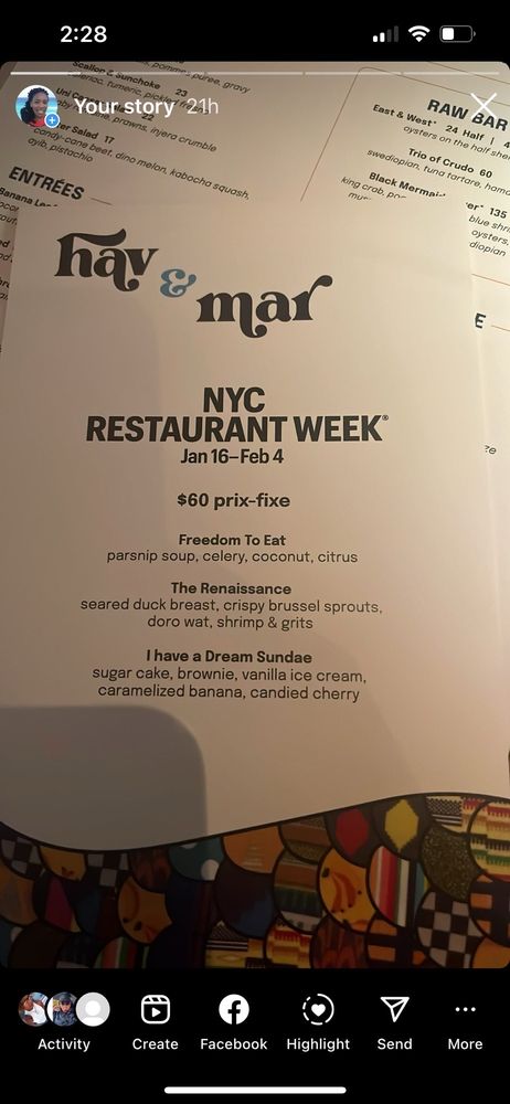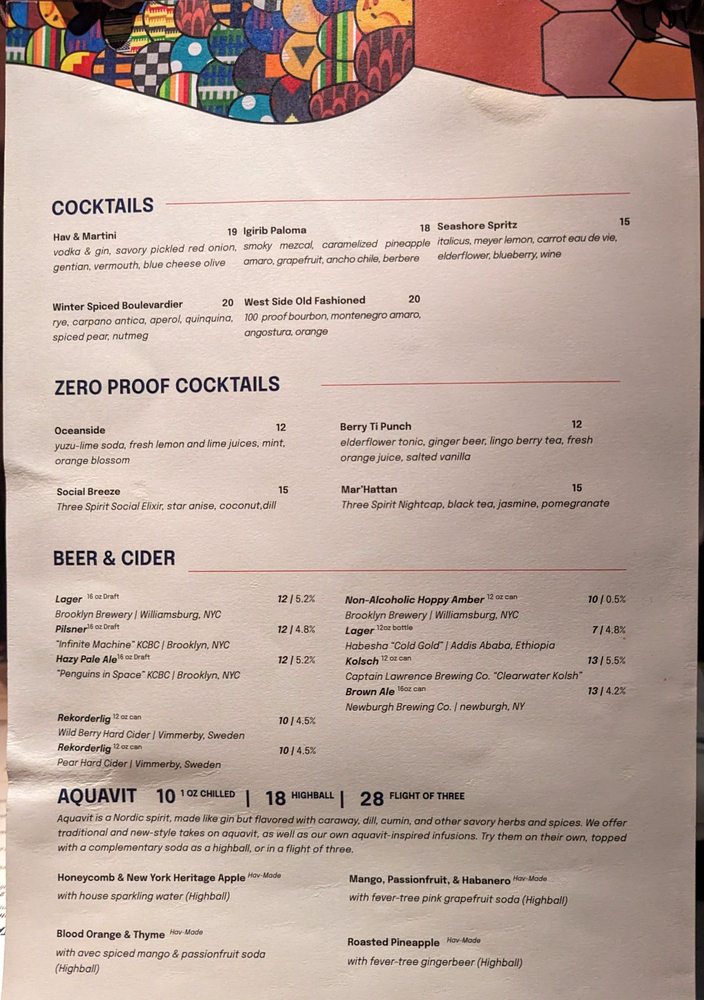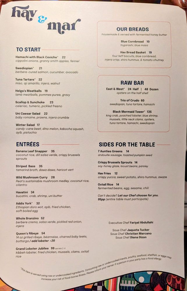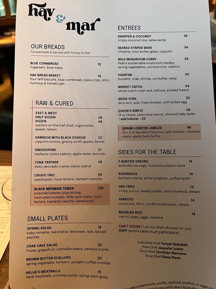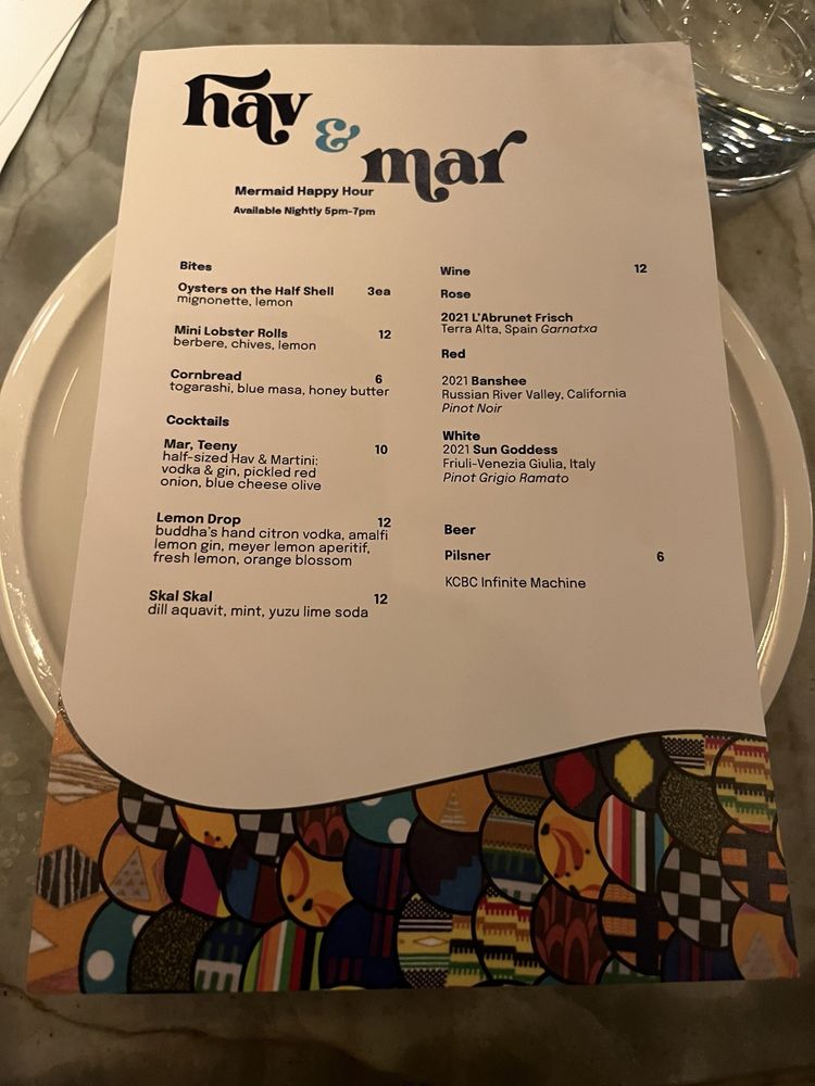 Introducing Hav & Mar, a trendy, upscale cocktail bar specializing in seafood located in New York City. The restaurant offers a variety of amenities, including reservations, takeout, and delivery, making it a convenient choice for diners. Known for its romantic ambiance and excellent service, Hav & Mar boasts a diverse menu featuring dishes like Tuna Tartare, Seared Striped Bass, and Havatini. Customers have raved about the delicious seafood options, with standouts including the crispy Sea Bass and the flavorful Havatini pasta. The restaurant also offers a range of zero-proof cocktails and delectable desserts, such as the Chocolate Cake. With a focus on sustainability and quality ingredients, Hav & Mar provides a unique dining experience that is sure to impress seafood enthusiasts.